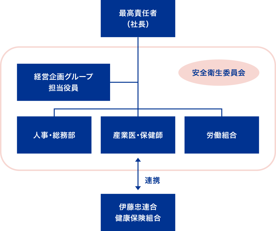 当社における健康経営の推進体制は、健康経営最高責任者である代表取締役の下、経営企画グループ長、人事・総務部、産業医、保健師が一体となり、様々な施策を展開しています。伊藤忠連合健康保険組合とも社員の健康を維持する取り組みを継続的に行っています。